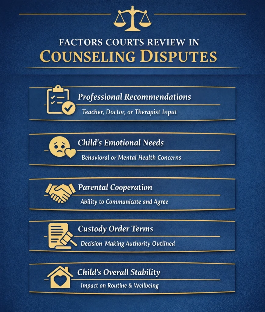 When disagreements arise, courts examine the child’s emotional needs, professional recommendations, and the existing custody order. Judges may also review documentation such as school reports, medical evaluations, and communication between parents. These records help the court determine whether counseling may support the child’s wellbeing.