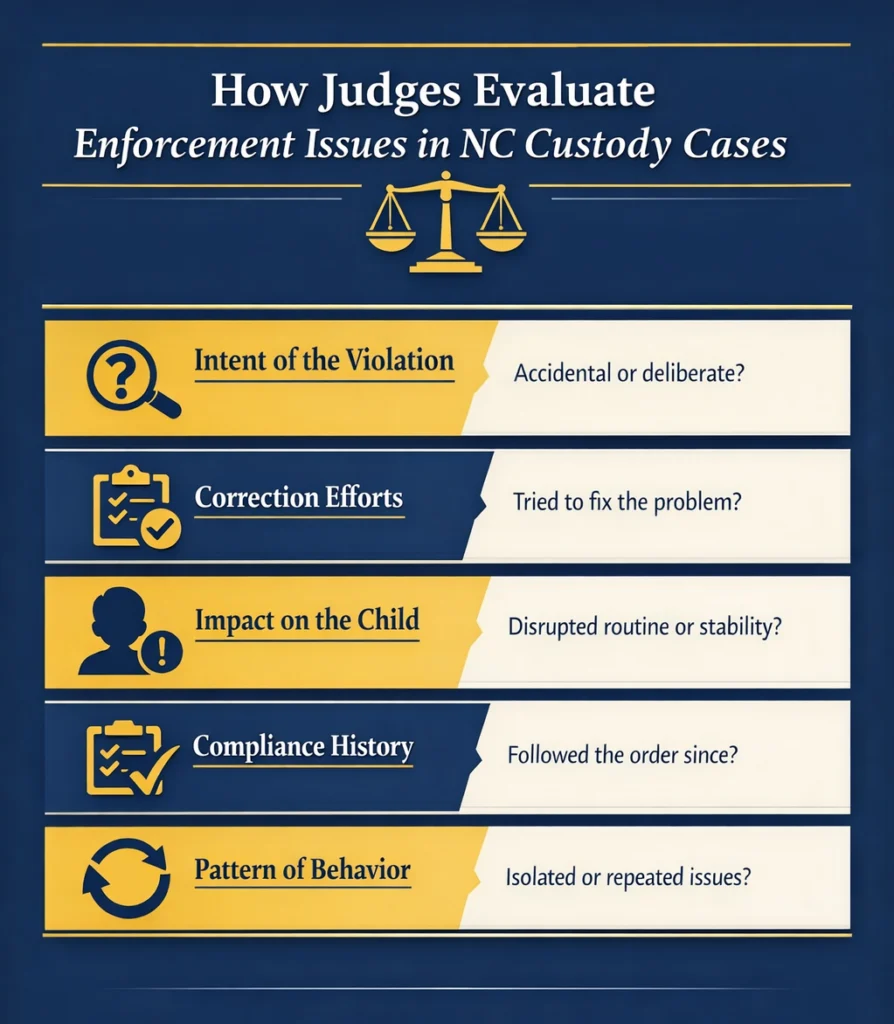 When parents ask a court to change an existing custody order, judges often review how both parties followed the original order. In many enforcement records custody modification in NC cases, courts examine prior enforcement actions to determine whether the current custody arrangement is working as intended. A history of compliance may support stability, while repeated violations or disputes may raise concerns about how the order functions in practice.