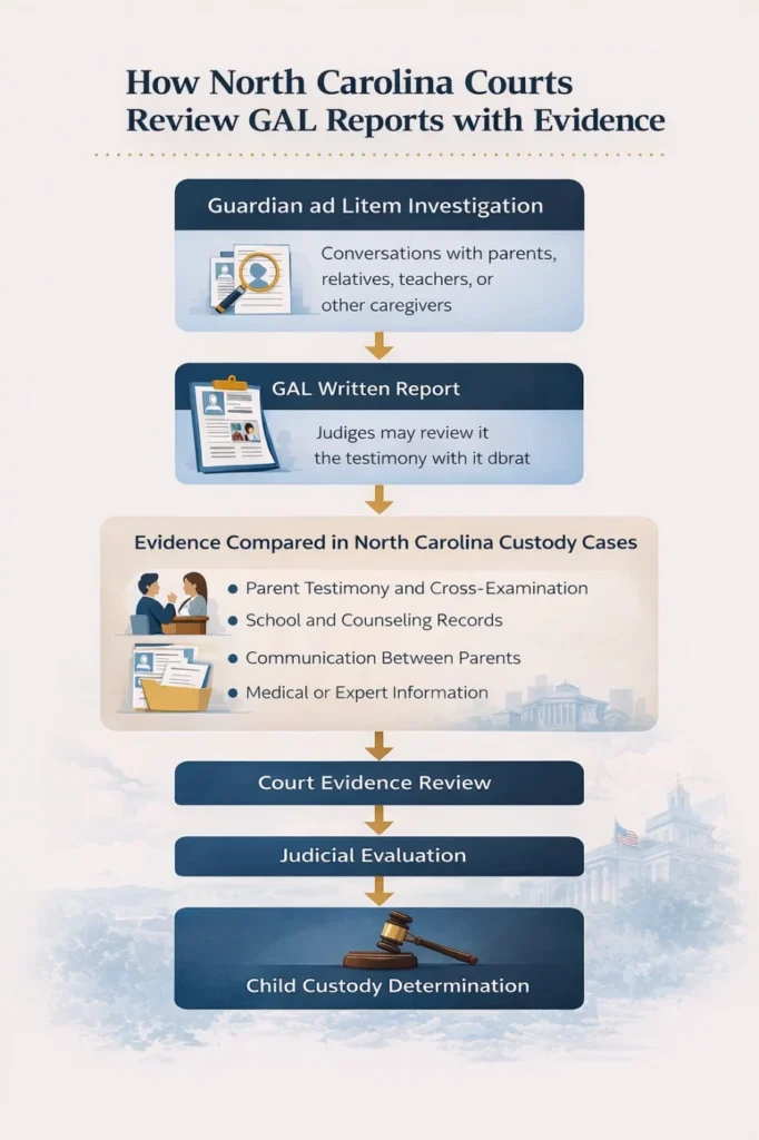 A guardian ad litem report in North Carolina custody cases helps courts review information about the child’s environment, relationships, and daily life during contested custody disputes. Judges examine the report alongside testimony, records, and other evidence to better understand the child’s circumstances before making custody decisions.