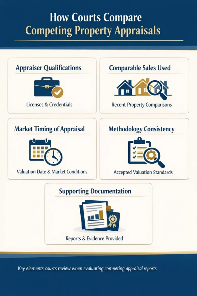 Courts review multiple factors when determining which appraisal is more reliable. Judges examine both the process used and the supporting evidence within each report.