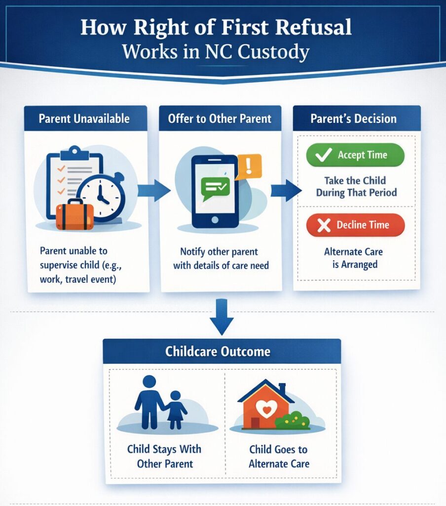 A right of first refusal custody NC clause creates a clear process when a parent cannot personally supervise the child during scheduled parenting time. Instead of arranging outside childcare immediately, the parent may need to offer that time to the other parent first.