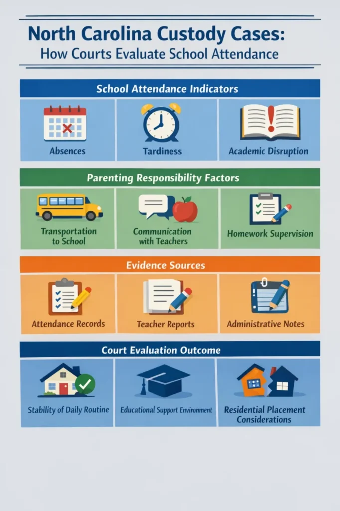 In North Carolina custody cases, school attendance can provide insight into a child’s daily stability and the level of parental involvement in education.