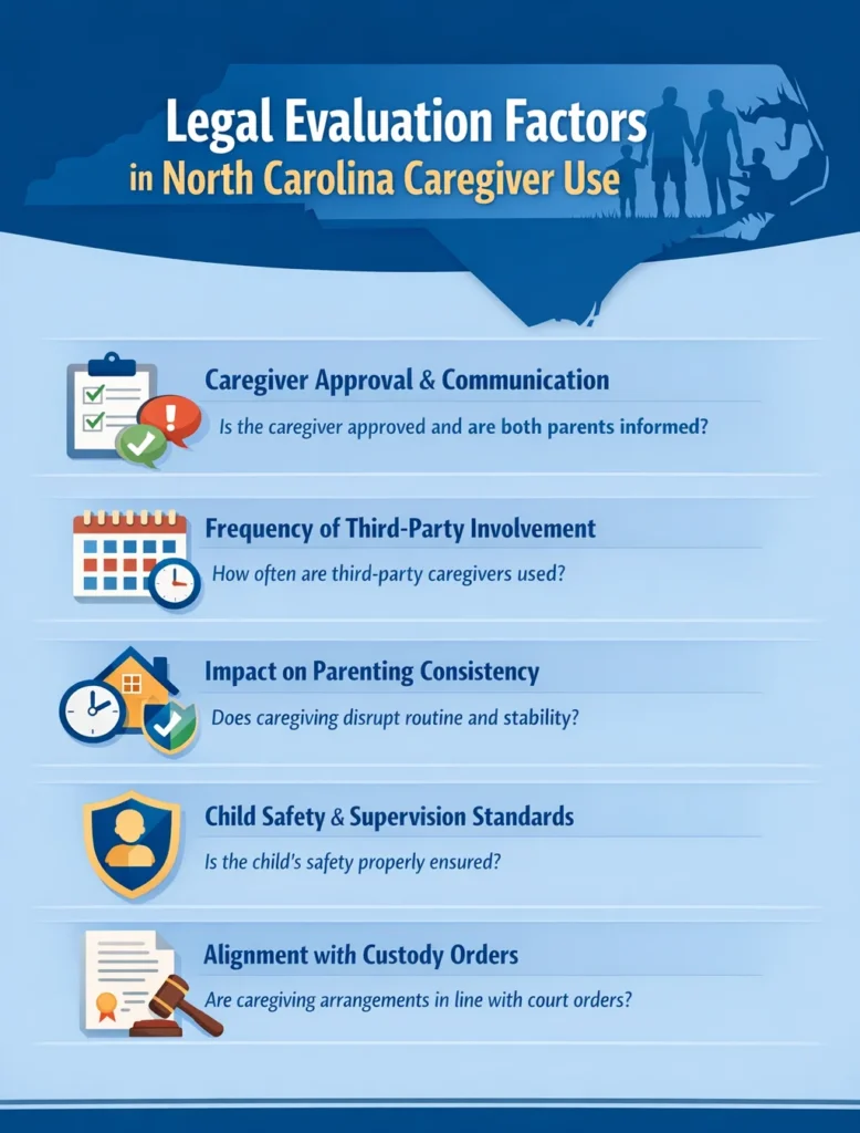 Courts evaluate caregiver use by looking at how the arrangement affects the child’s stability, safety, and consistency. The infographic below outlines the key factors judges consider when reviewing third party caregiver custody NC situations.